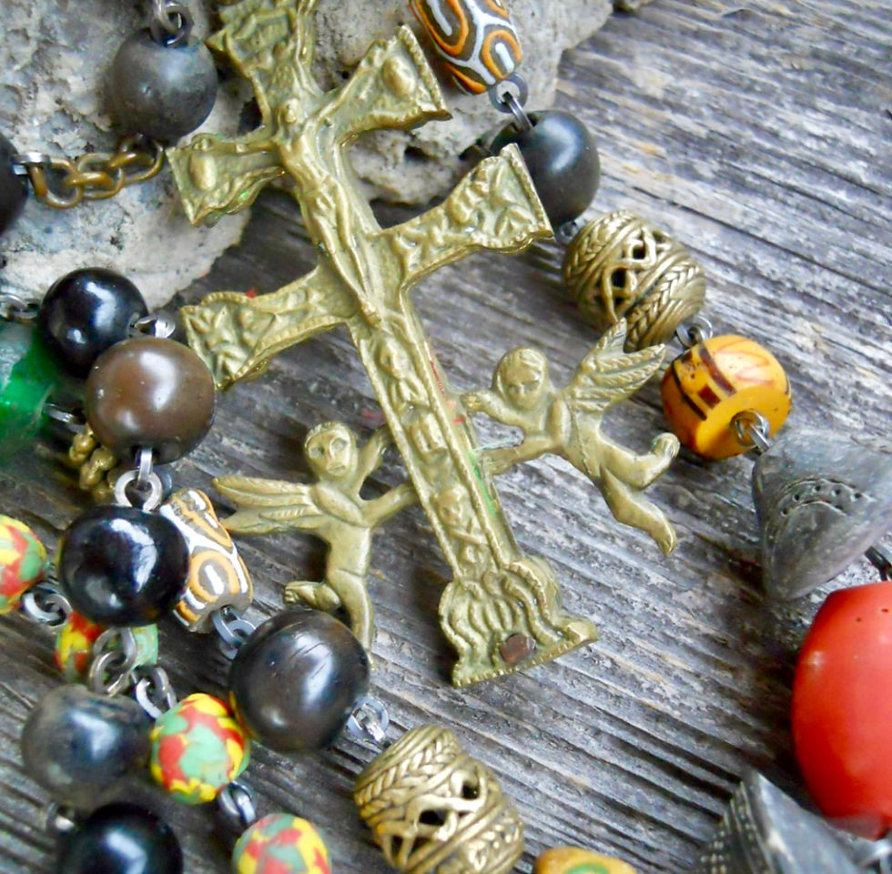 A more bohemian collection of treasures featuring dramatic old African, Russian and Venetian trade beads combined with antique bog oak, hand-carved jade and bone findings. Antique inlaid Egyptian and Nepalese beads along with ancient glass make up this line.